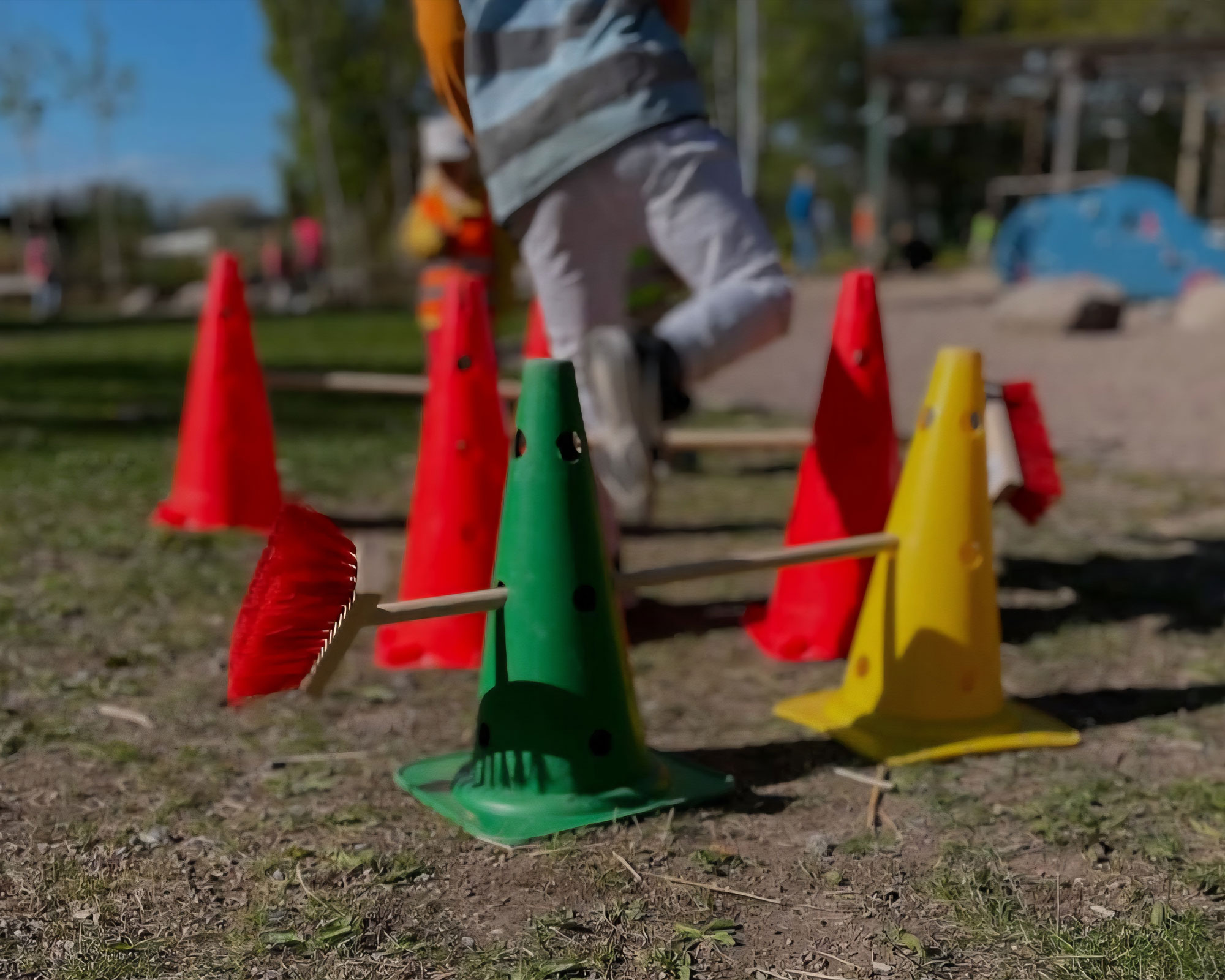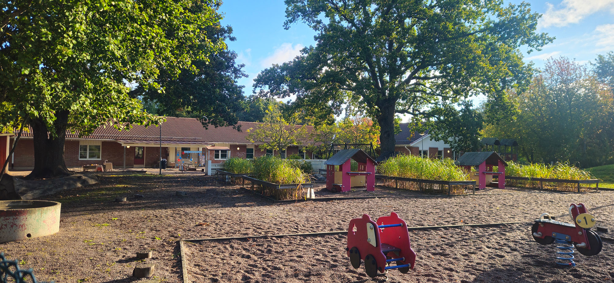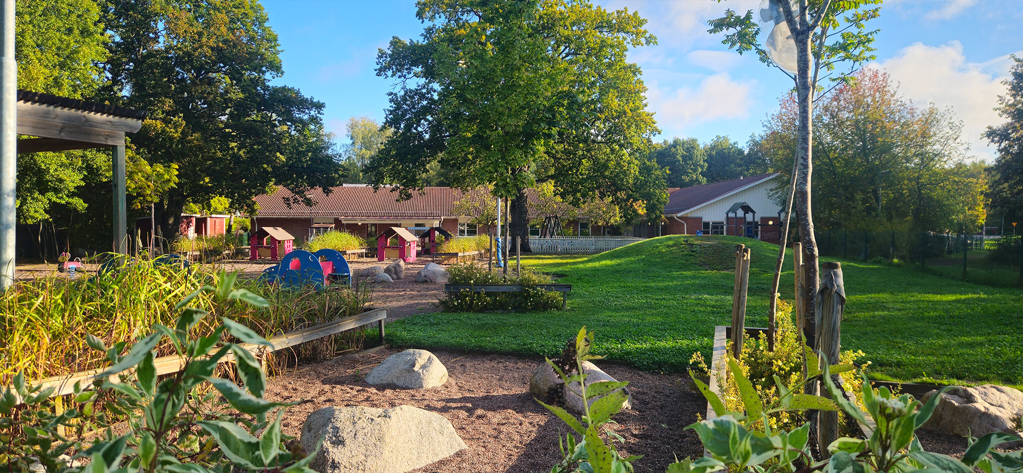 Enligt forskning har förskolegårdens storlek och utformning stor betydelse för hur mycket barnen rör på sig. Ju mer tillgänglig och inbjudande utemiljö, desto mer aktivitet – och utomhus rör sig barn ofta dubbelt så mycket som inomhus. Hos oss är gården därför en viktig del av lärmiljön. De stora ekarna ger inte bara skugga, utan deras ekollon blir skatter som barnen samlar och förvandlar till pengar i en lek eller till ingredienser i en fantasifull soppa. På samma sätt plockas vinbären till lekar, utforskande och samtal. Barnen får använda sin fantasi och kreativitet i samspelet med naturen, och gårdens resurser blir en naturlig del av både lek och lärande.
